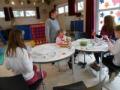 Wir basteln Osterkränze und malen lustige Osterhasen aus.
